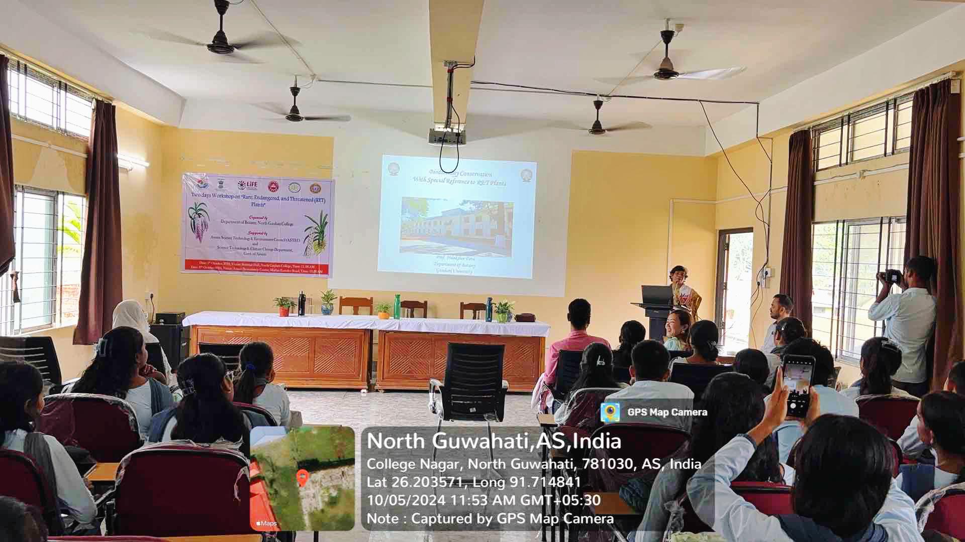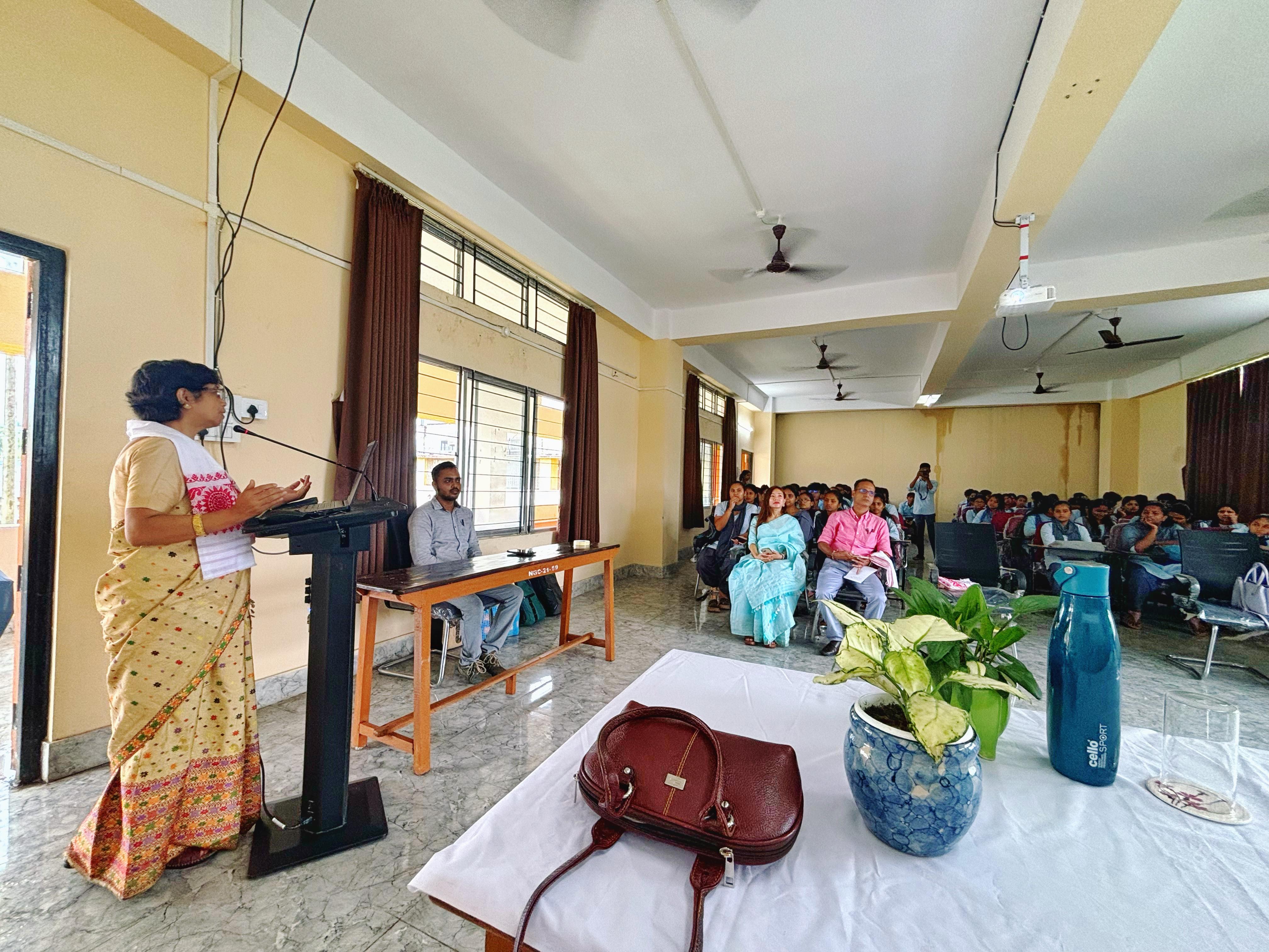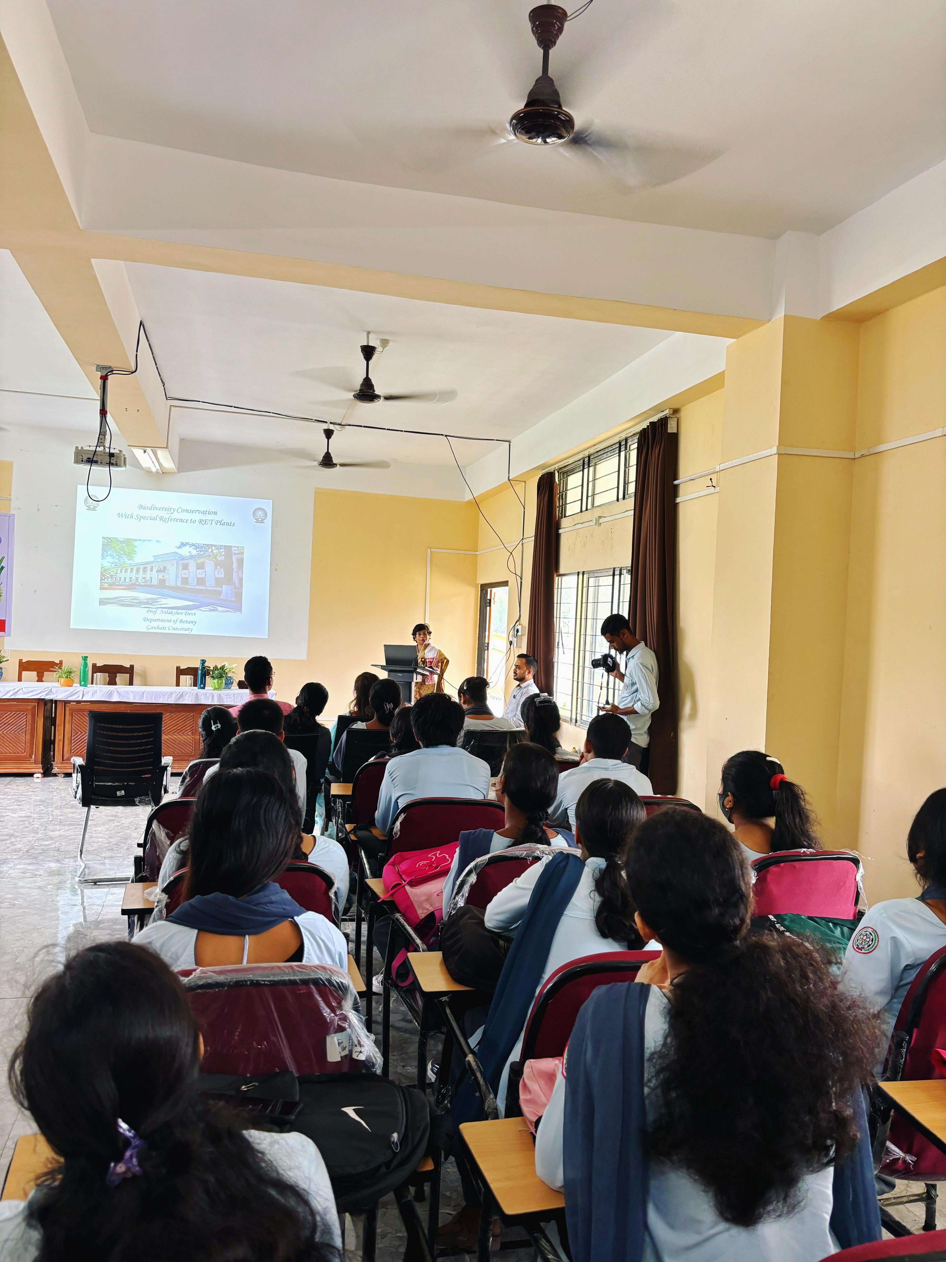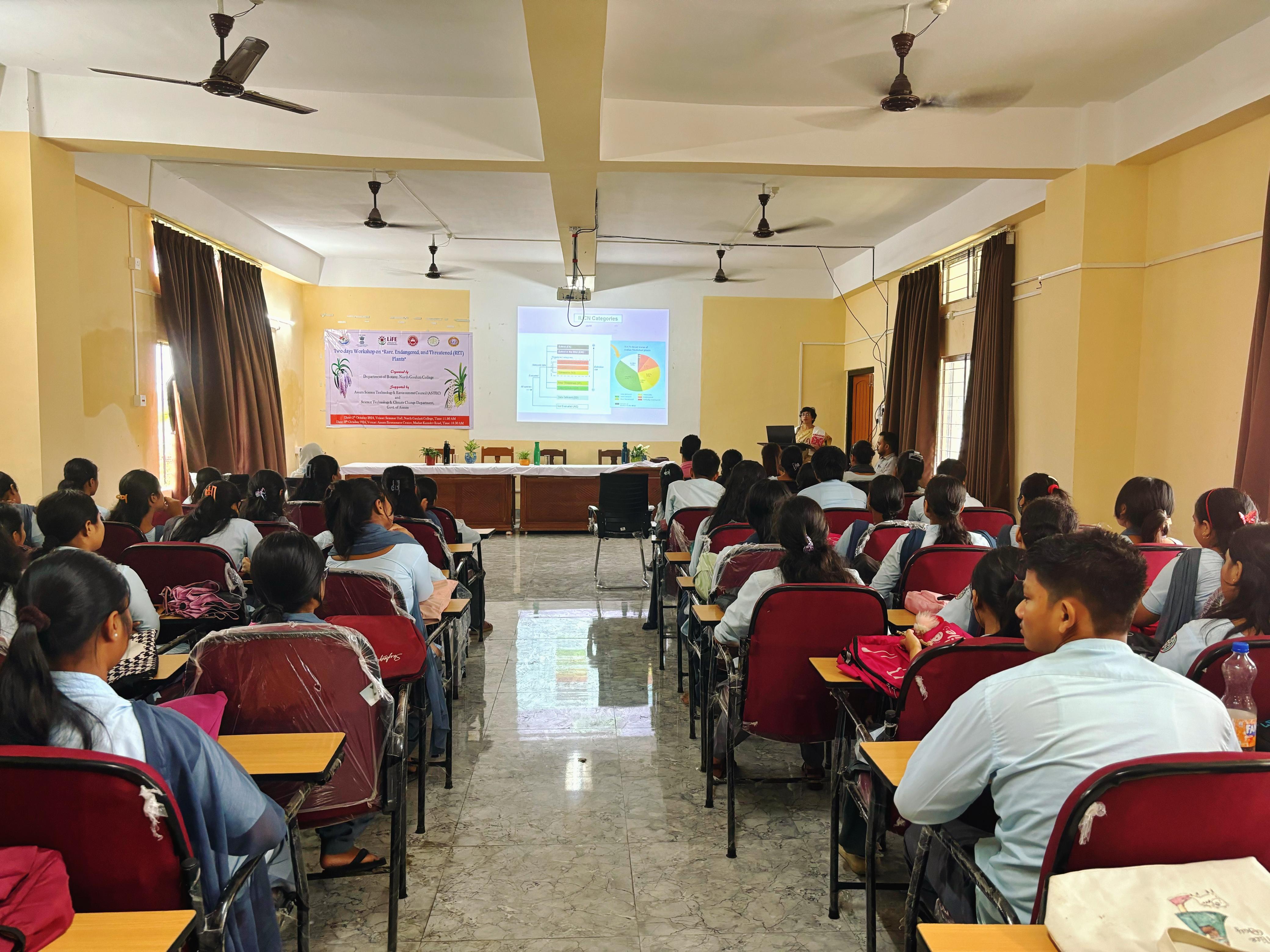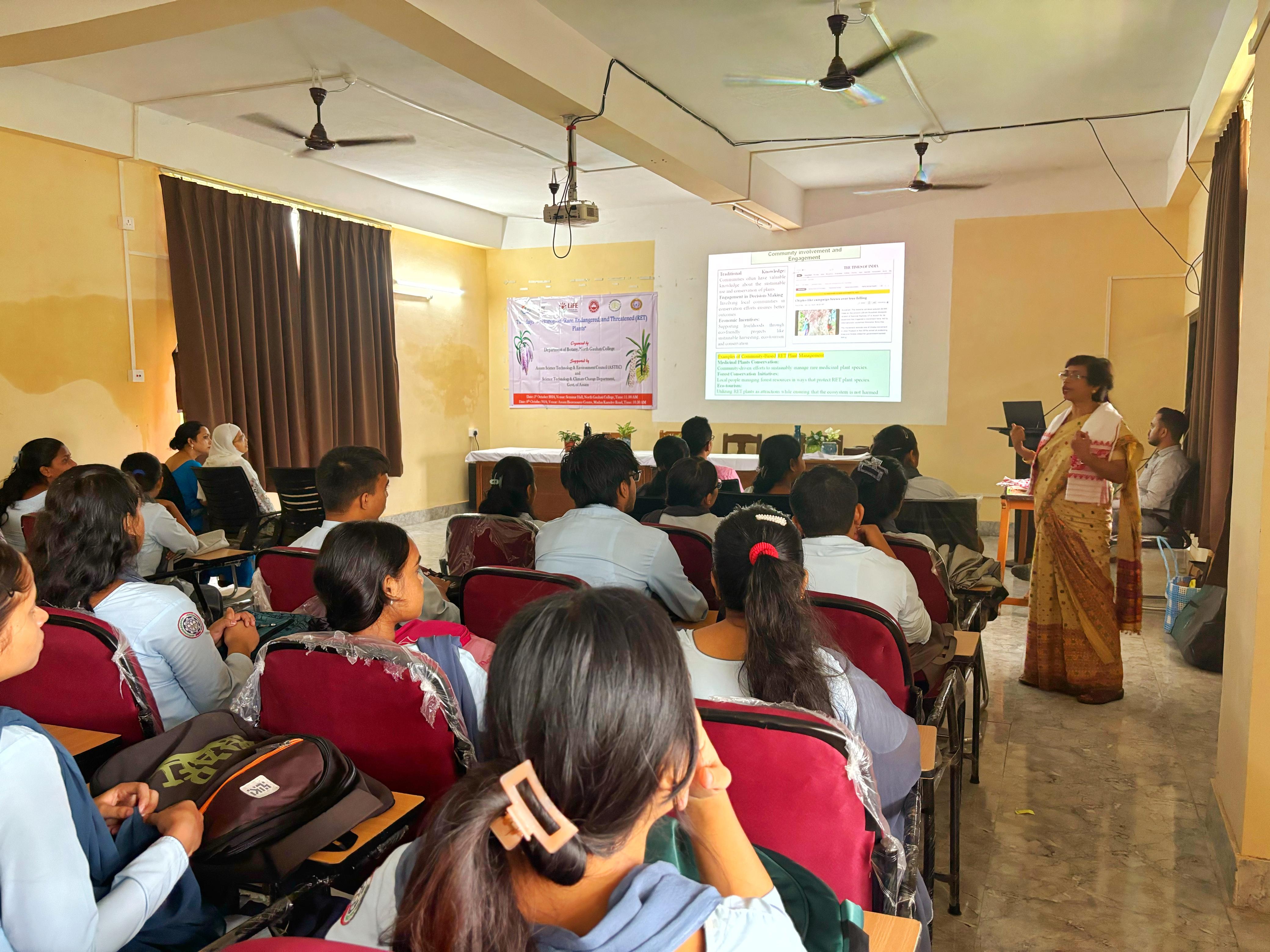 Popular talk by Prof. Nilakshee Devi on Day 1 of Workshop on "Rare, Endangered, and Threatened (RET) Plants" organised by Dept. of Botany, North Gauhati College and supported by ASTEC, and Science Technology & Climate Change on 05.10.2024