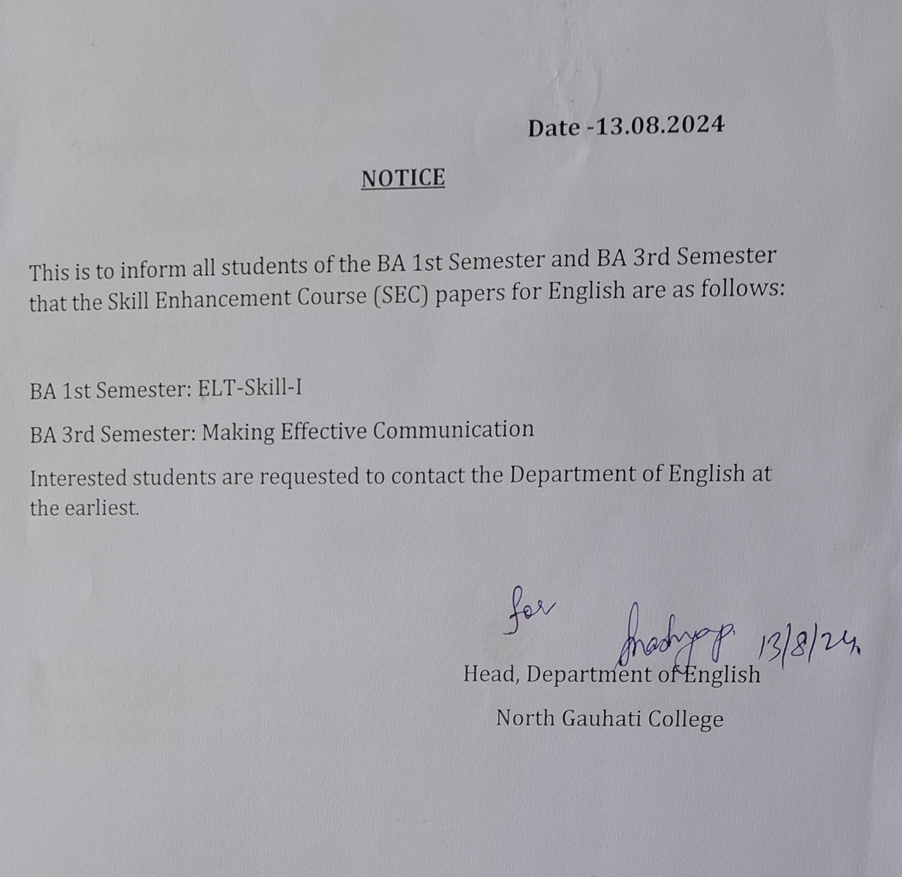 Presently the department has four sanctioned posts. Headship is offered by means of rotation as norms set by Govt, of Assam. Dr. Shikha Kashyap, an Associate Professor joined the department on 01-08-96 and her area of specialization is in Indian English Writing. Besides writing articles and presenting in National and International Conferences, she is also a Doctoral Thesis Referee under R.T.M. University, Nagpur. Dr. Maloshi Choudhury, who is former Head of the Department and an Associate Professor. She joined the department in 28-07-2000 and pursued her Ph.D, in the field of English Language Teaching. She has contributed by writing books, articles and has presented papers in National and International Conferences. The present Head of the Department, Dr. Jewelina Choudhury, an Associate Professor joined North Gauhati College on 28-09-22 as a Lecturer. Her area of specialization is in Indian English Writing, and she has also contributed by writing articles in renowned journal and has presented her papers in seminars and conferences. Ms, Devastuti Sharma joined the department on 30-08-16 as an Asst. Professor and is pursuing her Ph.D in the area of Retellings of William Shakespeare. She focuses her writings on gender and sexuality.
