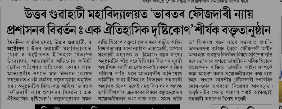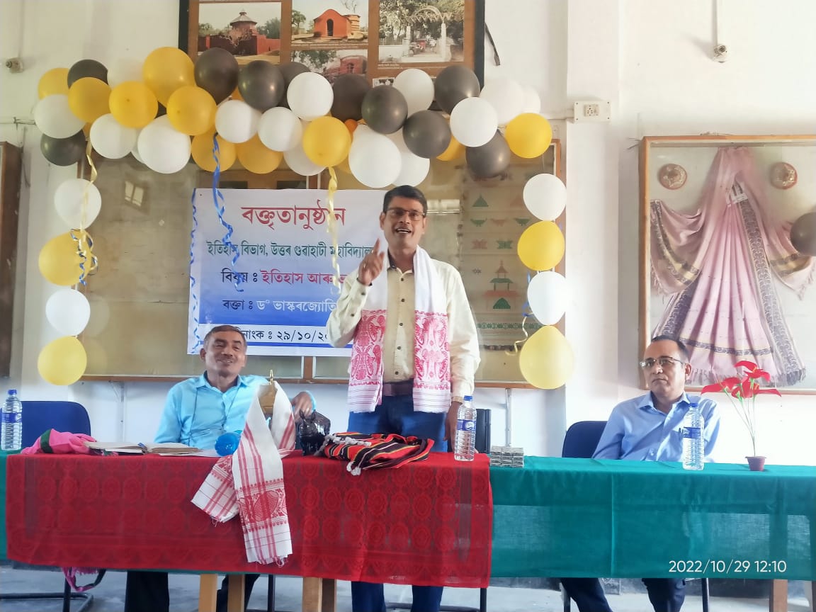 North Guwahati is a glorious historical place of North Eastern Region -India, situated on the North Bank of the mighty Brahmaputra river in Kamrup district,Assam. North Gauhati College was established in 1962 in the name of its location. The Department of History was also started on the day of inception of the College. This is one of the most important department of the college as North Guwahati is full of historical events from the rule of the ancient Kamrupa Kingdom. During the Ahom rule, the Battle of Saraighat, considered to be one of the most notable event in the history of Assam, took place at this location. North Guwahati was also a temporary capital of the greatest king of Ahom Monarchy, Swargadeo Rudra Singha . He made a plan to attack the Mughal invader who were occupying large parts of the state and to send them out of the state. For this purpose, he temporally shifted his capital to North Guwahati and raised an army force. Unfortunately, the great king Rudra Singha died in this place before starting the war.