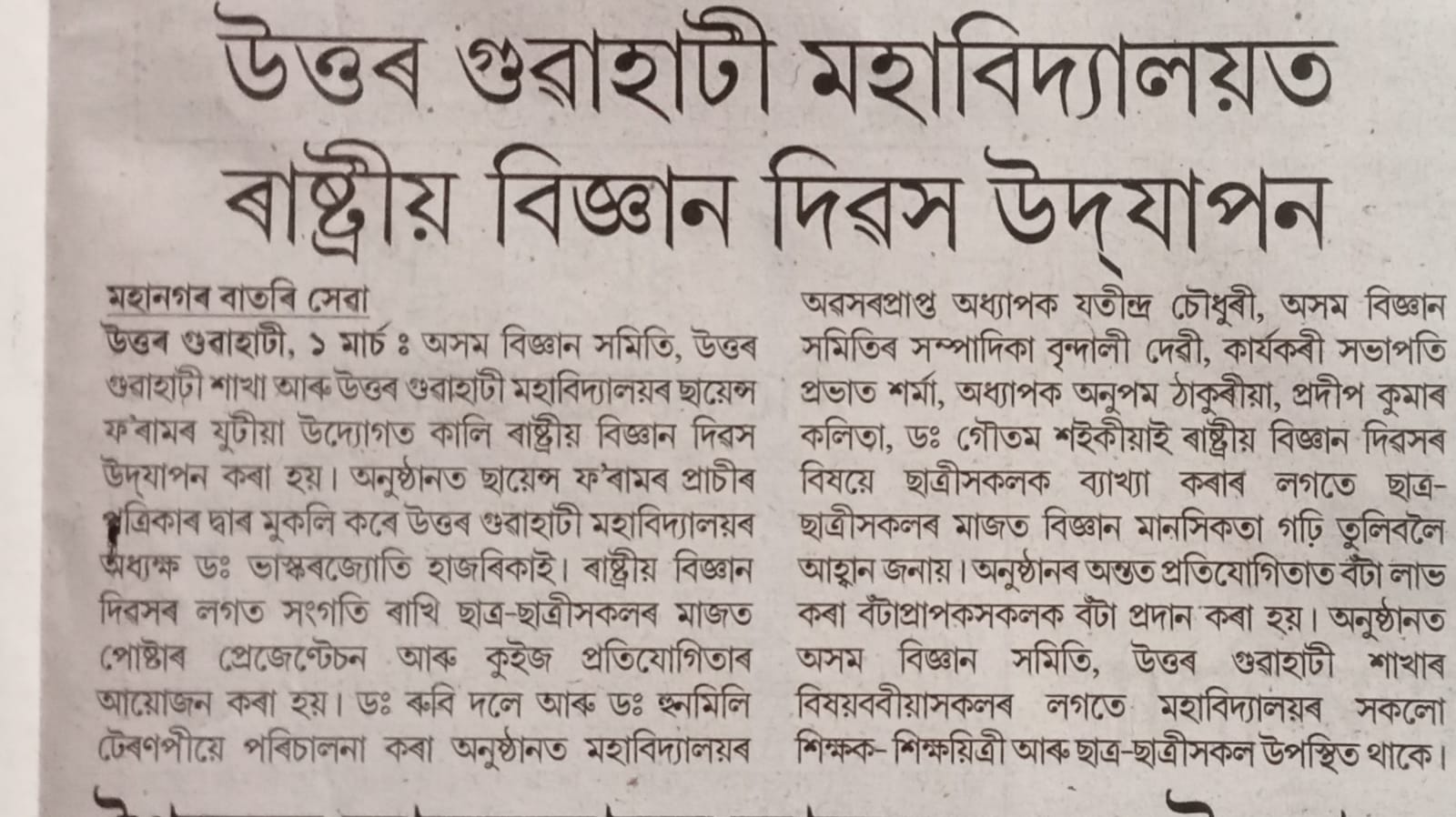 National Science Day 2025 organised by Science Forum, North Gauhati College on 28.02.2025